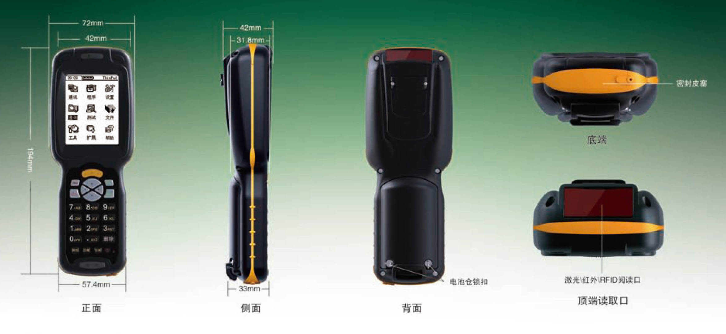 坚固耐用,良好的“三防”性能:采用工业级标准的处理器和主要元器件。它出色的结构设计及符合IP65标准的密封,使产品具有很好的防尘、防潮、抗震效果,可承受从1.5米高度多次跌落到水泥地面的冲击,从而降低了设备的维护成本。
